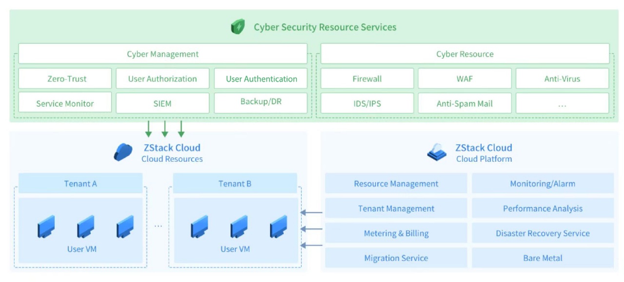 The ZStack security solution meets the cloud users’ needs for virus protection, access control, intrusion detection, intrusion prevention, and virtual patching. It also offers capabilities such as integrity monitoring, log auditing, asset management, vulnerability risk management, detection and response, baseline inspection, and host resource monitoring. This comprehensive solution helps customers build a multi-layered, all-encompassing security defense system.